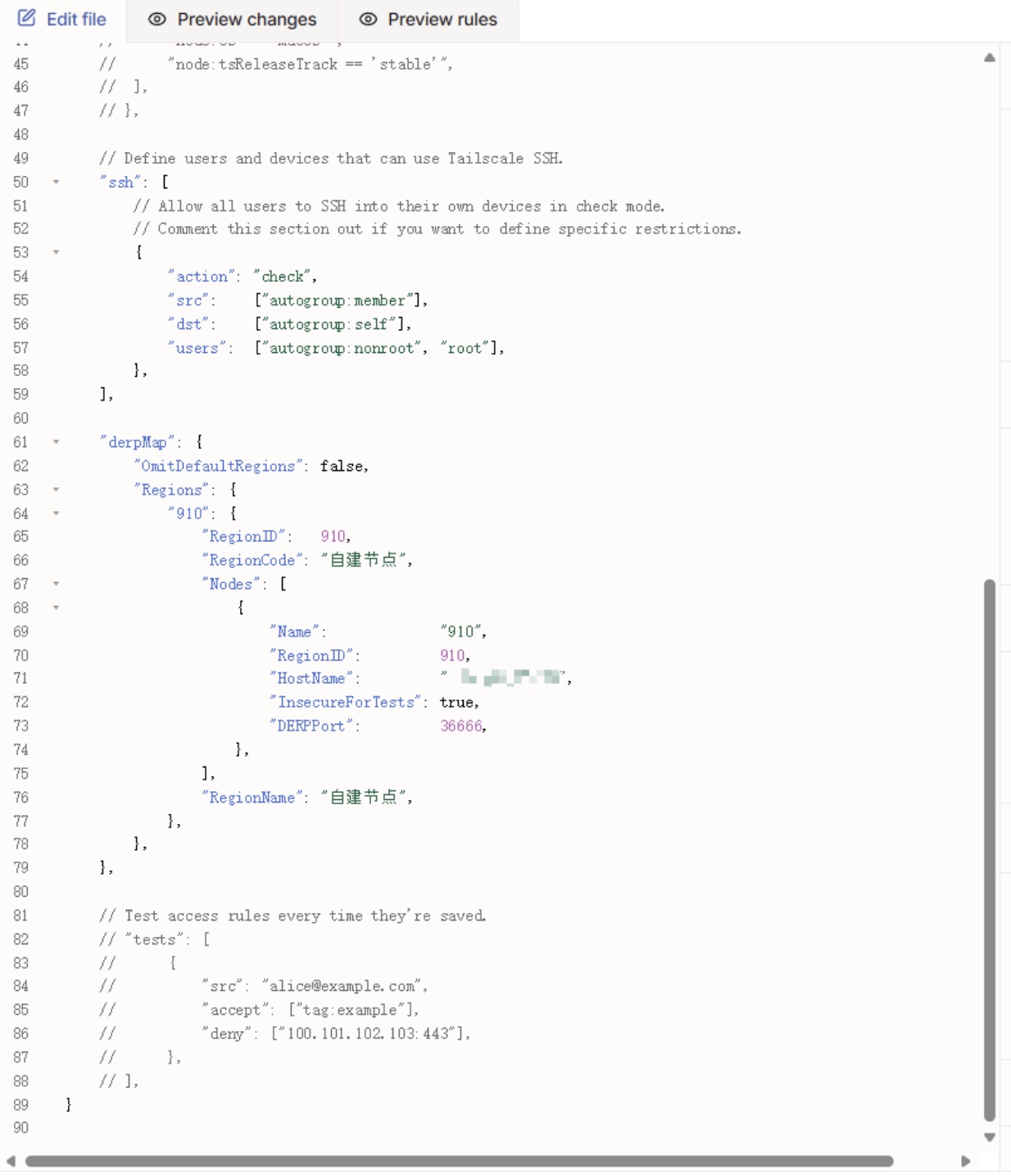 进入 Tailscale 管理后台,编辑网络设置中的 DERP 节点配置: